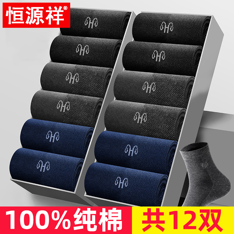 恒源祥袜子男士中筒袜纯棉夏季薄款中老年爸爸袜防臭透气男袜 均码(39码-44码纯棉防臭) 黑色+深灰+藏青超值12双装