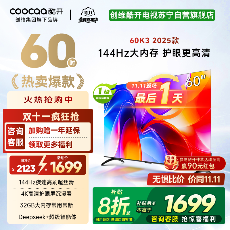 创维电视 酷开K6 Ultra 75英寸Mini LED电视deepseek2304分区一级能效144Hz新款75P8F