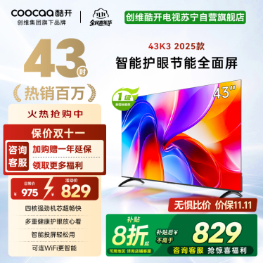创维酷开 43英寸节能护眼新款智能全面屏电视 高清投屏互联网电视 家用卧室老人电视小尺寸电视