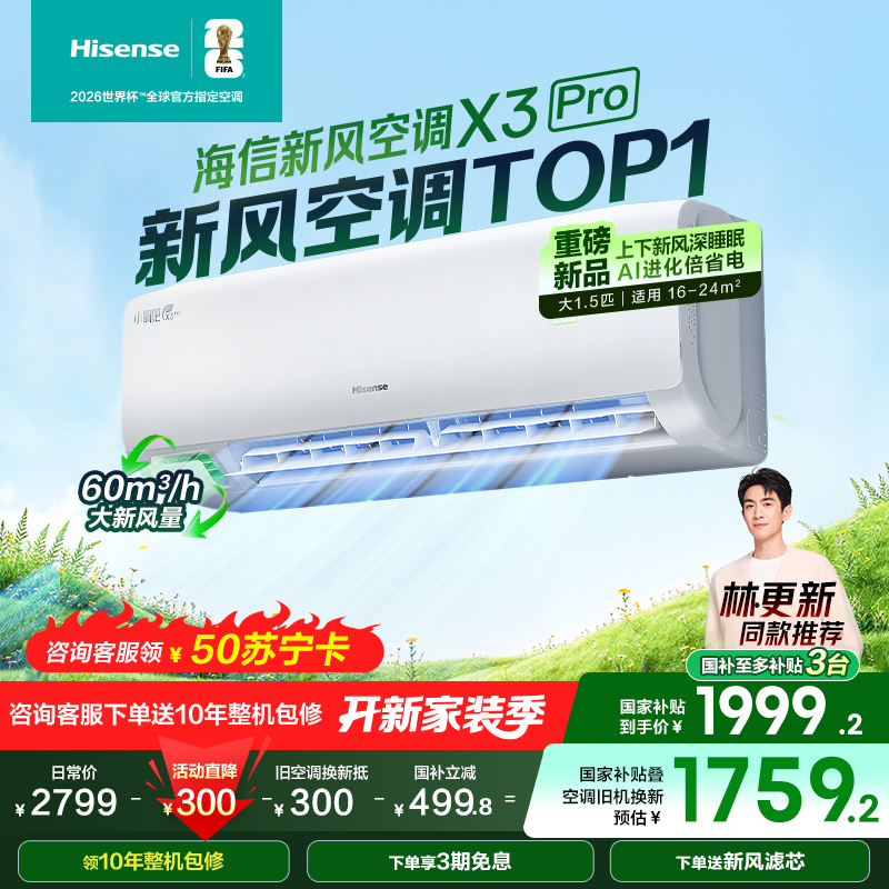 海信 新风空调 1.5匹 新风增氧 AI省电 轻音不打扰 新一级能效卧室挂机 家用空调KFR-35GW X300U-X1