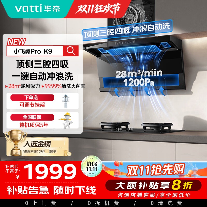 华帝(vatti)油烟机[小飞翼Pro K9]28风量大吸力脱排油烟机 i111K9超薄平嵌7字型变频顶侧双吸三腔自动洗