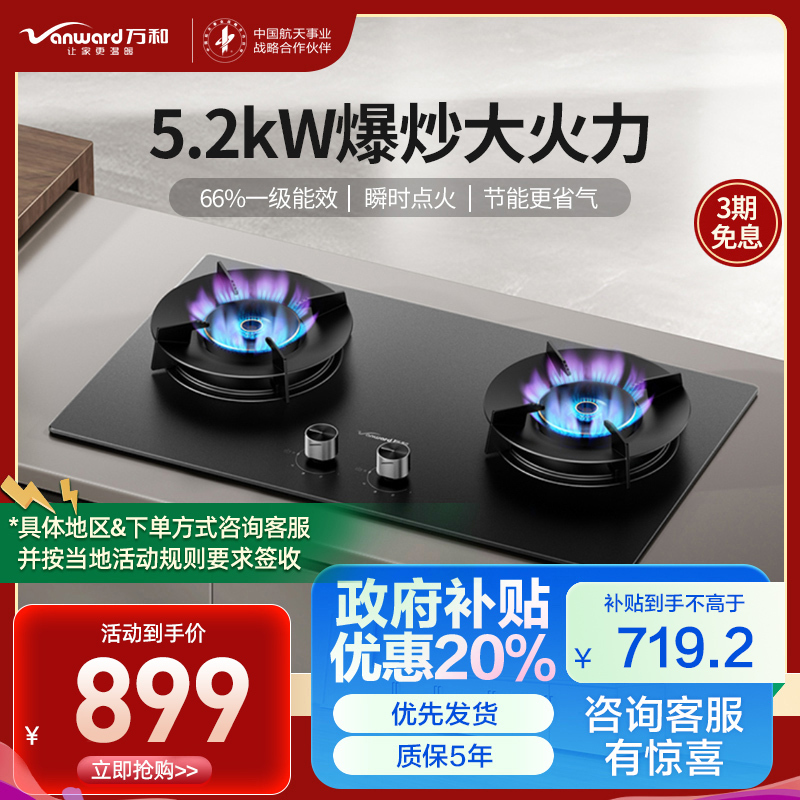 万和(Vanward)一级能效 天然气燃气灶不锈钢面板 5.0KW火力嵌入台式两用灶具 双眼灶JZT-B7B53