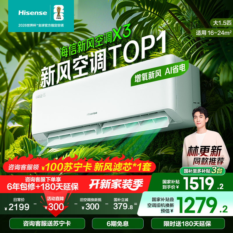 海信 新风空调 1.5匹 新风增氧 AI省电 轻音不打扰 新一级能效卧室挂机 家用空调KFR-35GW/X300U-X1