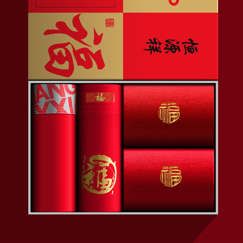 恒源祥男士内裤本命年属虎年四角短裤头纯棉大红色结婚平角裤_368 175/XL B款【4内裤】前程似锦