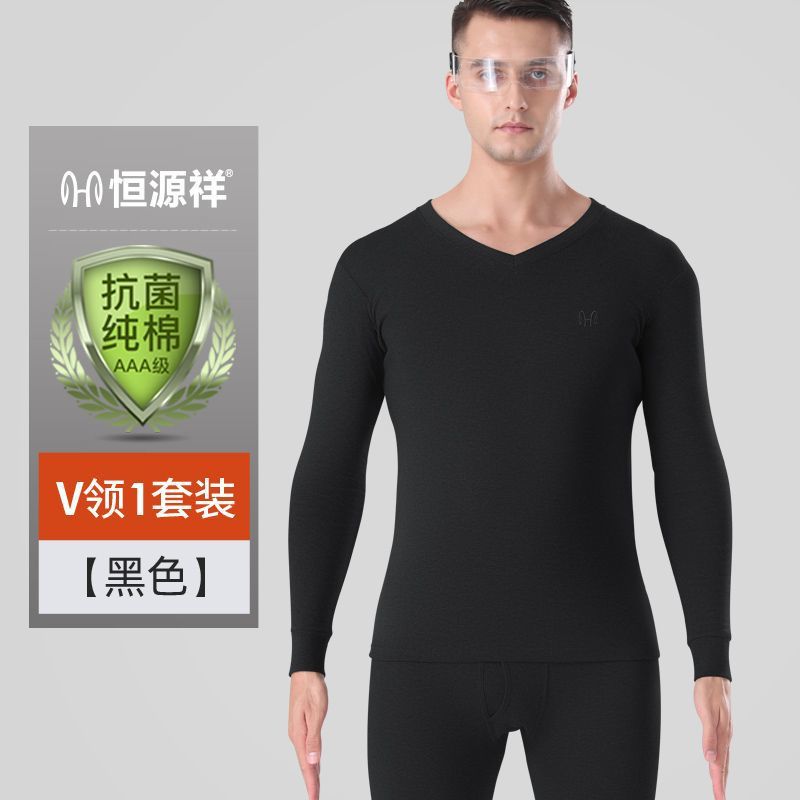 恒源祥男士纯棉毛衫秋衣单件上衣中高领保暖大码内衣套装男秋冬季_192 185/3XL 上衣+裤子【纯棉V领】黑色