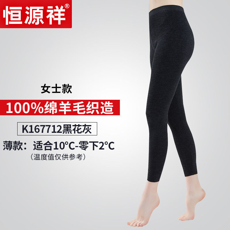 恒源祥纯澳洲羊毛裤男士秋裤薄款秋冬季加厚内穿打底护膝保暖裤女 XL175 女士薄款-黑花灰