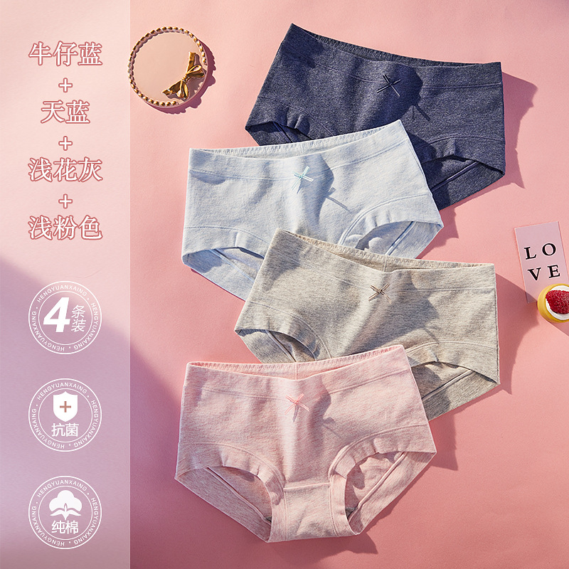 恒源祥女士内裤女纯棉棉透气夏季薄款中腰少女无痕三角裤头 165/L 牛仔蓝+天蓝+浅花灰+浅粉色