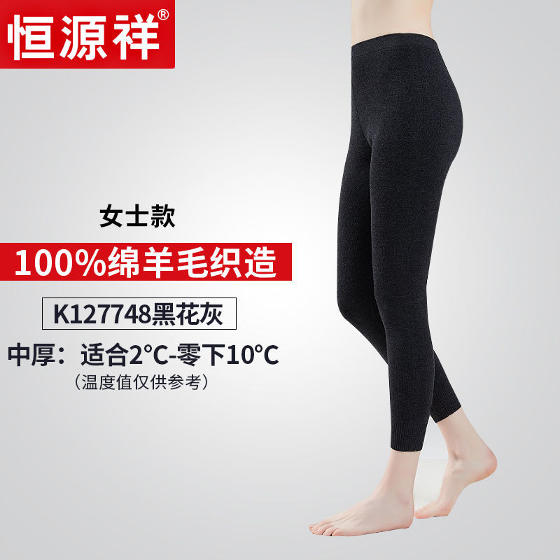 恒源祥纯澳洲羊毛裤男士秋裤薄款秋冬季加厚内穿打底护膝保暖裤女 XL175 女士厚款-黑花灰
