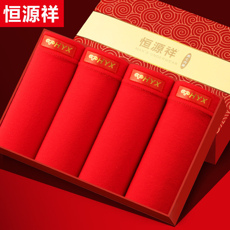 恒源祥本命年内裤男士平角裤鸿运纯棉裤头四角短裤结婚大红色内裤 2XL 鸿运内裤4条装(滴胶款+鸿运盒装)