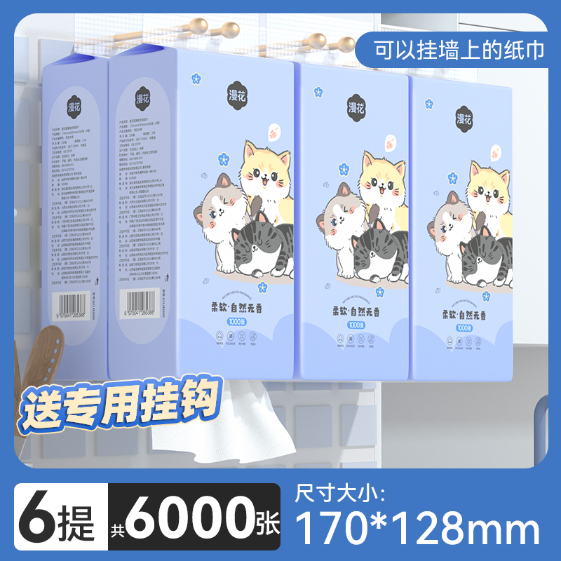 漫花大提悬挂式抽纸整箱批发纸巾家用实惠装餐巾纸厕所纸卫生纸抽 4层1000张*6提漫花蓝猫挂抽