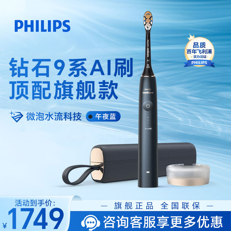 飞利浦(PHILIPS)电动牙刷 钻石AI智能刷 成人声波震动牙刷男士女士便携软毛刷 生日礼物午夜蓝 HX9996/12