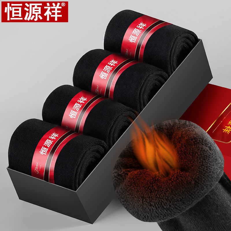 恒源祥袜子女纯棉加厚保暖秋冬季加绒抗寒韩版棉中筒毛巾长袜男_563 【100%纯棉加厚加绒】4双装 男款【全黑色】