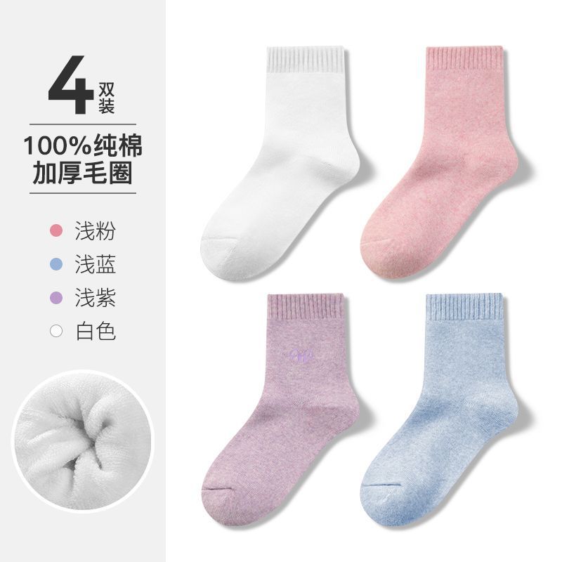 恒源祥女士袜子冬季加绒加厚保暖毛圈袜纯棉中筒毛巾底袜_371 均码【35-39码,加厚毛圈女袜】 【纯棉抗菌】4双混色