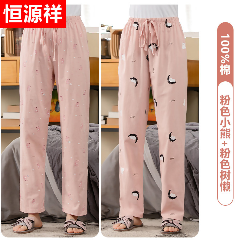 恒源祥睡裤女纯棉长裤春秋夏季薄款空调裤棉宽松可外穿家居裤冬_128 175(XXL) 【2条装】粉色小熊+粉色树懒
