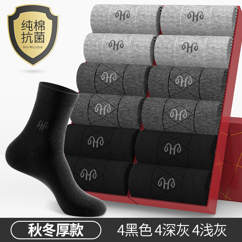 恒源祥袜子男纯棉防臭中筒袜秋冬厚款黑色薄款全棉男士商务袜_330 均码【100%纯棉抗菌防臭】 4黑4深灰4浅灰【厚款】