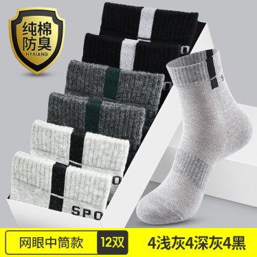 恒源祥袜子男士夏季纯棉吸汗防臭运动棉袜短袜白色中筒袜男袜全棉 12双网眼中筒款-4黑4深灰4浅灰 均码纯棉防臭收藏加购优先发货