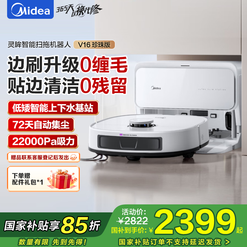 美的扫地机器人灵眸V16 珍珠版机械臂极限贴边飓风吸力毛发防缠 扫拖一体全自动清洁清洗集尘上下水版