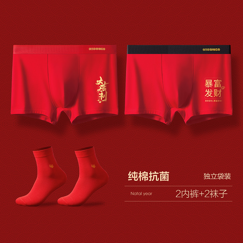 恒源祥本命年内裤男士平角裤纯棉大红色属虎年结婚四角短裤头_22 190/4XL 【2内裤2袜子】事业有成