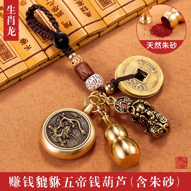 纯黄铜貔貅钥匙扣招财五帝钱葫芦装朱砂汽车挂件十二生肖挂饰朋友 赚钱【龙】+貔貅+五帝钱+葫芦