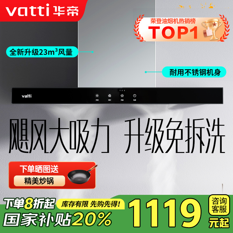 华帝(vatti) 大吸力油烟机i11109S 升级22m³免拆洗欧式顶吸触控式抽油烟机