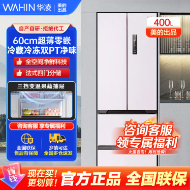 华凌冰箱 美的出品 60cm超薄零嵌入 法式多门一级能效节能省电全空间净味家用风冷冰箱HR-419WUFPZ