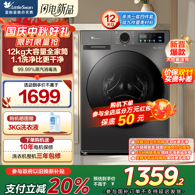 小天鹅(LittleSwan)12KG大容量变频全自动滚筒洗衣机 节能省电蒸汽消毒洗 一级能效 TG120V098WDT
