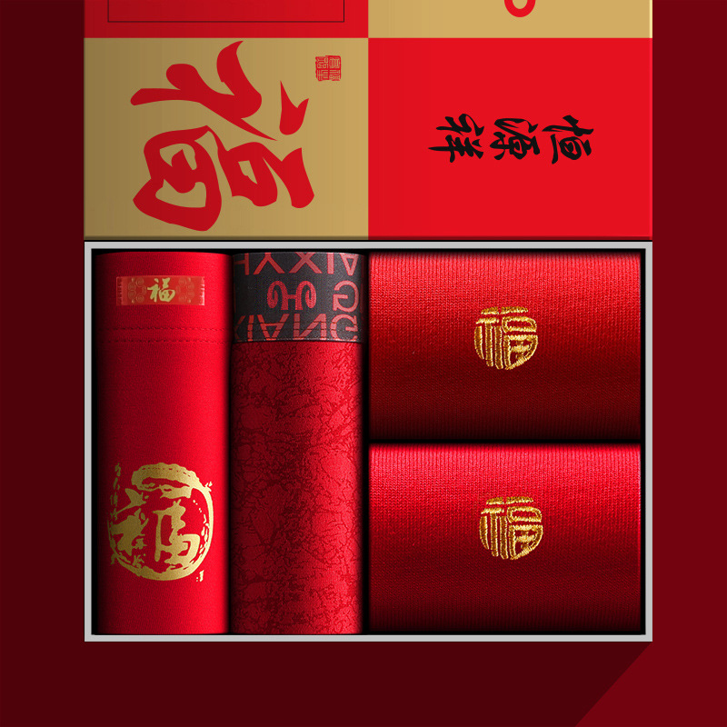 恒源祥男士内裤本命年属虎年四角短裤头纯棉大红色结婚平角裤_368 185/3XL C款【2内裤2袜子】蒸蒸日上