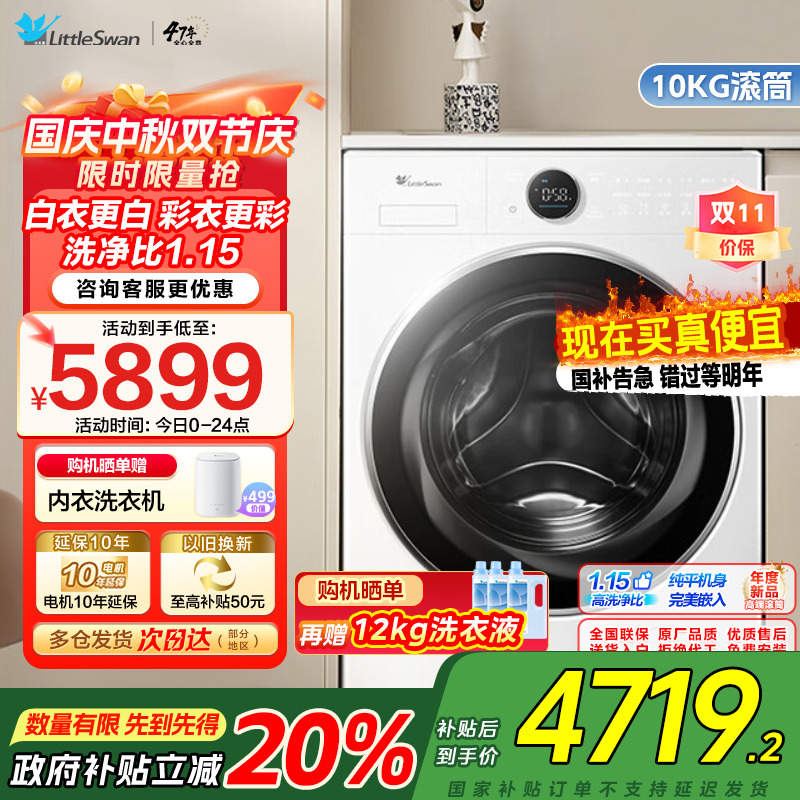 小天鹅小蓝鲸2.0滚筒洗衣机全自动家用纯平全嵌白色超薄蓝氧防串色 1.15超高净洗比 TG10VE80家电国家政府补贴