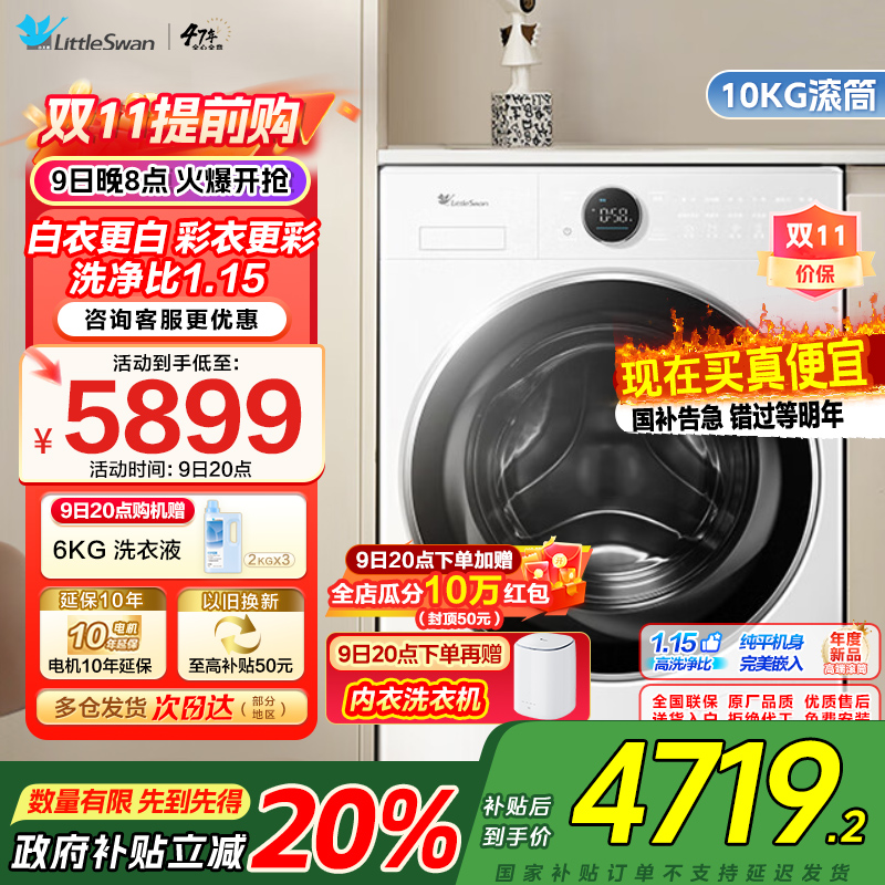 小天鹅(LittleSwan)滚筒洗衣机全自动家用水魔方10公斤以旧换新一级能效内衣洗国家补贴20% TG10V628T