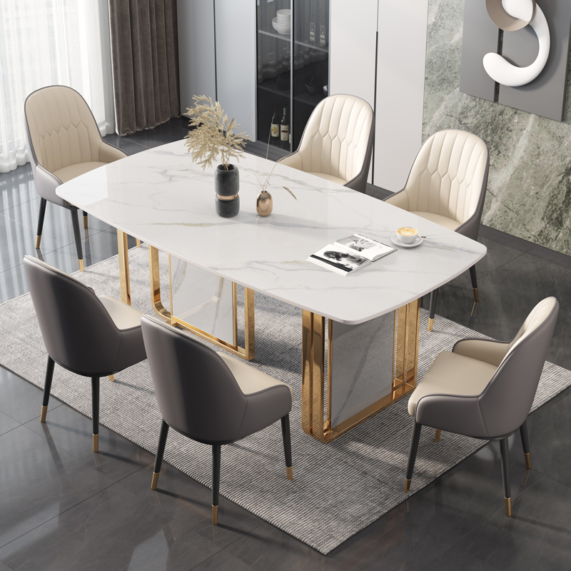 青木川 亮光岩板餐桌 轻奢餐桌椅组合现代简约1.3米1.6米1.8M带电磁炉餐厅客厅家用吃饭桌子长方形小户型酒店网红 雪花白 一桌六椅【1.4米长】