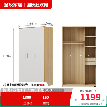 全友家居北欧现代三门衣柜 清新木纹带L灯储物收纳衣橱卧室整体家具 【腊木木纹A款】三门衣柜