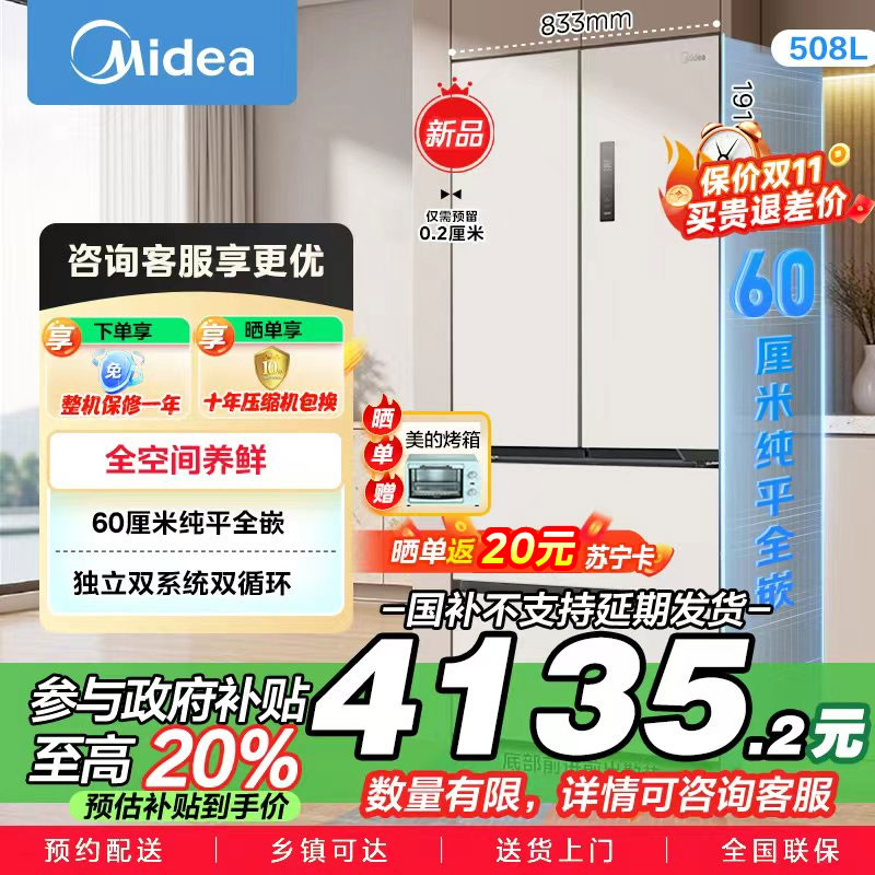 美的[真香系列]508法式多门60cm超薄零嵌入四开门双系统底部散热冰箱国家补贴20% BCD-508WUFPZM(E)