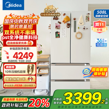 美的(Midea)508升变频一级能效法式多门双系统双循环除菌净味冰箱大容量BCD-508WTPZM(E)白色 国补