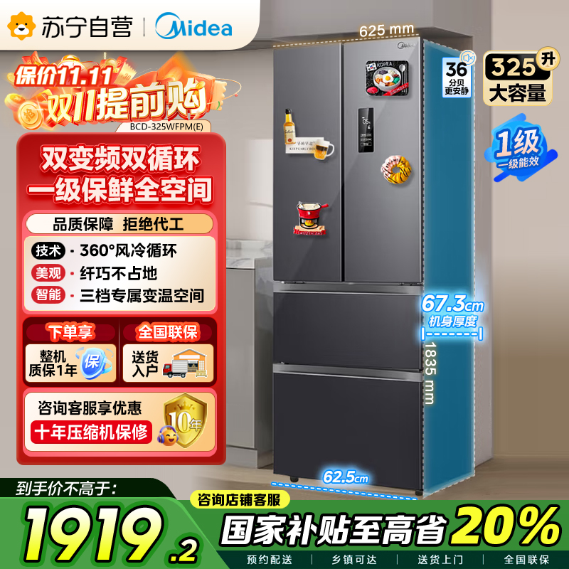 美的(Midea)325升法式多门冰箱一级能效双变频四开门小型家用电冰箱超薄风冷无霜节能低噪BCD-325WFPM(E)