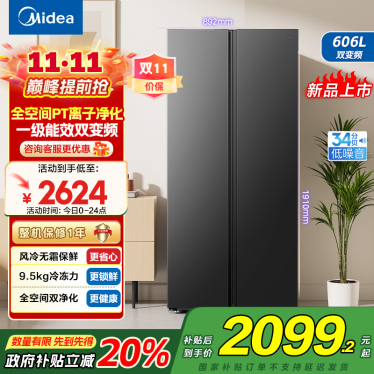 美的(Midea)606L大容量对开门电冰箱双开门双变频一级能效超薄BCD-606WKPM(E) 炭灰风冷无霜净味国补