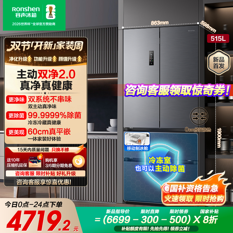 容声方糖515升主动净味双系统法式多门四开门超薄嵌入式电冰箱制冰一级能效灰色冰箱 BCD-515P60FZMAD