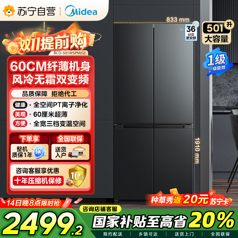 美的(Midea)60cm薄501十字四开门一级变频风冷无霜智能家用大容量电冰箱BCD-501WSPM(Q)炭灰-浮光