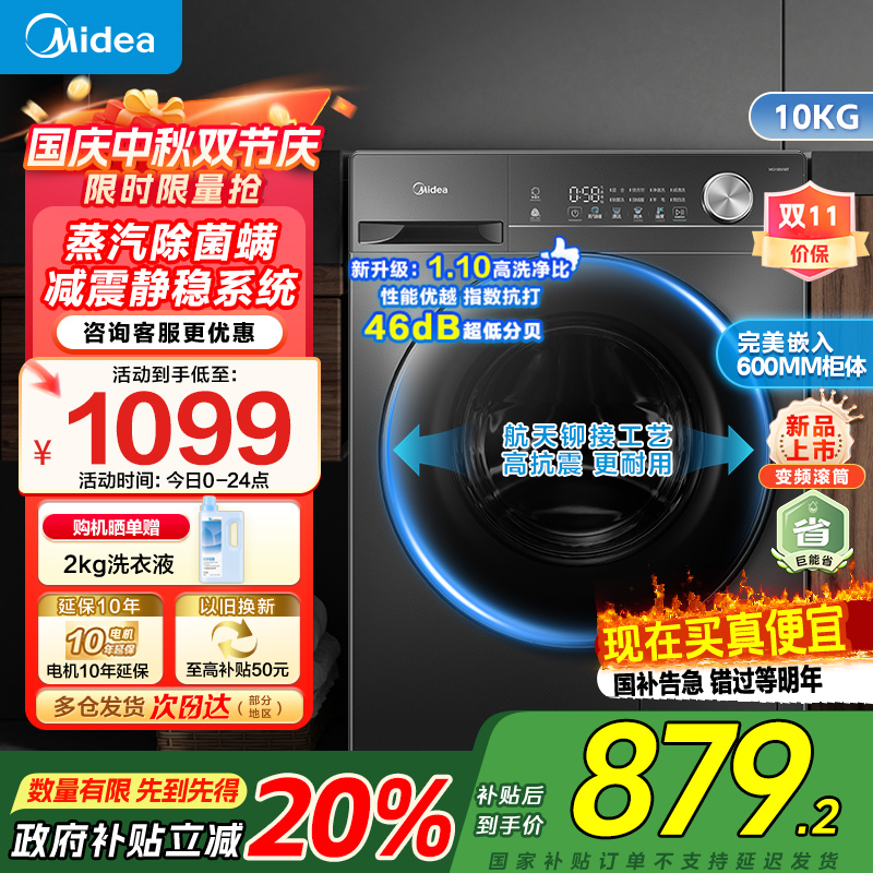 [苏宁自营]美的全自动滚筒洗衣机10公斤家用变频一级能效1.1高洗净比蒸汽除菌除螨MG100V36T家电国家政府补贴
