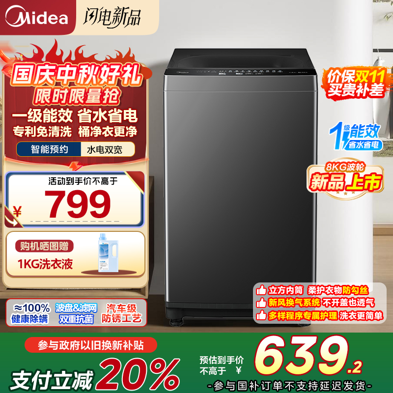 [苏宁自营]美的(Midea)波轮洗衣机全自动家用 MB80V37T 8公斤 升级一级能效 抗菌除螨 专利免清洗