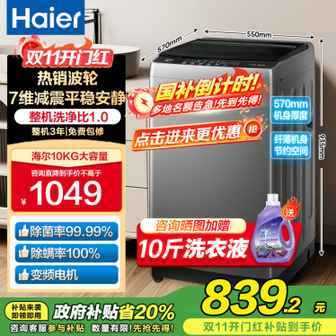 海尔(Haier)10公斤 全自动 波轮洗衣机 1级能效 自编程 纳米微泡净 除螨洗 消费补贴 XQB100-Z10B0