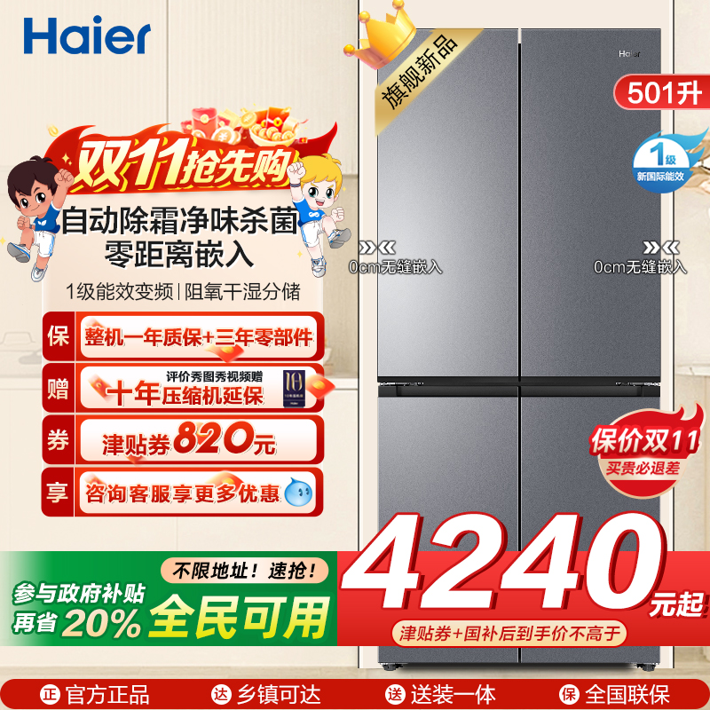海尔(Haier)冰箱四开门 风冷无霜406升十字对开门家用超薄嵌入式智能家用电冰箱[406L四门冰箱]星石蓝+一级能效