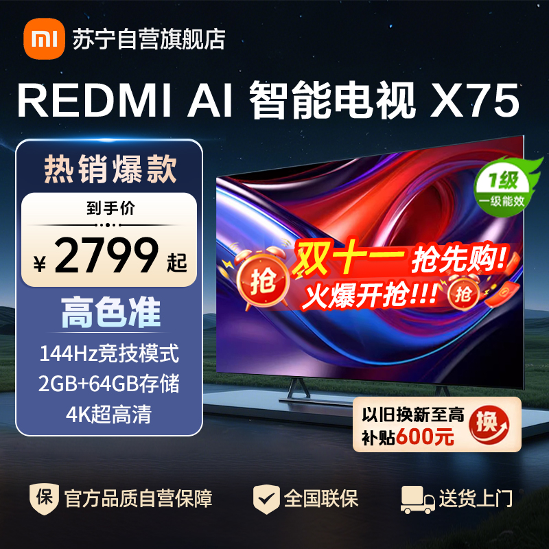 小米电视75英寸AI智能X75一级能效144Hz高刷64G大储存4K超高清智能语音教育网络液晶平板-L75RB-XT