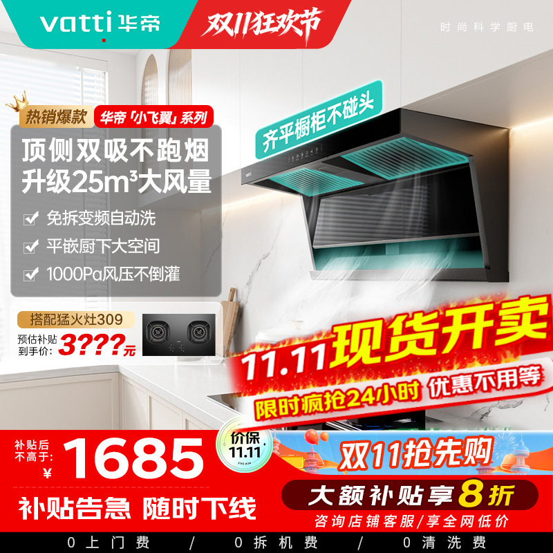 华帝(vatti)[小飞翼Pro K9]小飞碟28风量大吸力脱排油烟机 i111K9超薄平嵌7字型变频顶侧双吸三腔自动洗