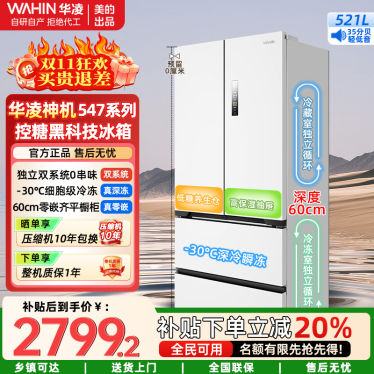 美的出品华凌神机60cm薄零嵌入法式多门双系统双循环全空间净味家用一级能效冰箱HR-547WUFPZ白月光 家电国家补贴