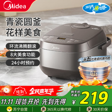 美的(Midea)电饭煲MB-4E65电饭锅家用4L大容量柴火饭青瓷圆灶抗菌内胆智能预约多功能蒸煮煲汤煮粥煮饭锅