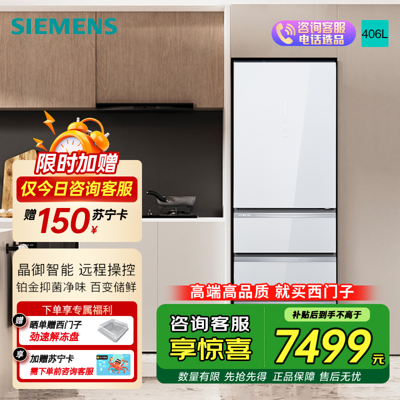 西门子406L多门家用智能电冰箱一级能效超薄嵌入玻璃面板多门冰箱KG402053VC