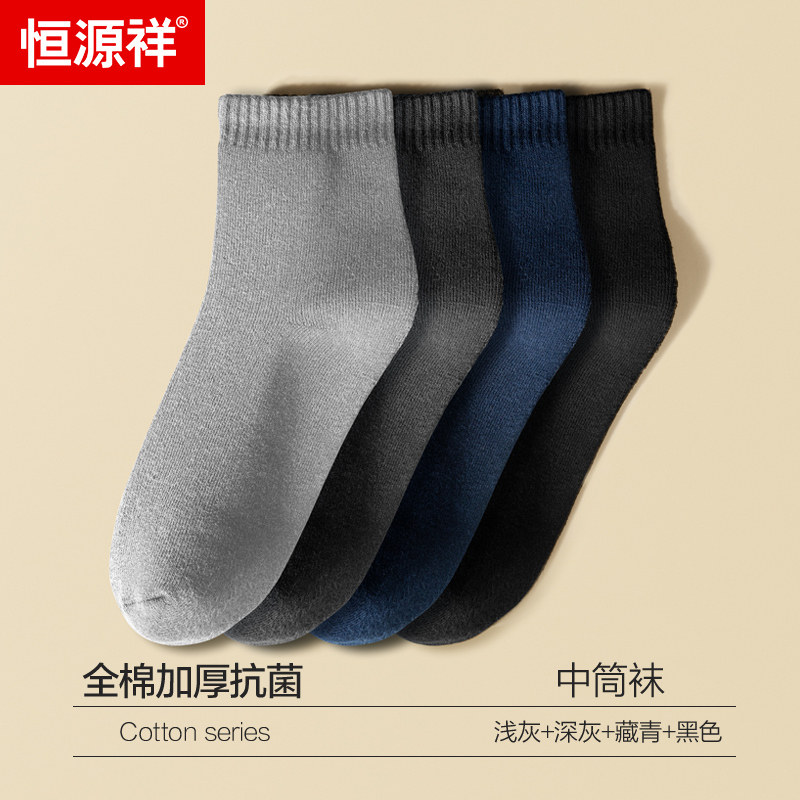 恒源祥男士袜子纯棉毛巾袜加绒毛圈全棉防臭吸汗秋冬季保暖中筒袜_239 39-44码均码 【4双加厚纯棉抗菌毛圈】黑1藏青1深灰1浅灰1