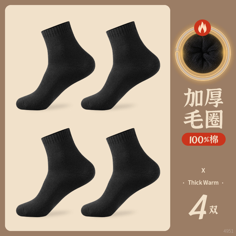 恒源祥男士袜子冬季棉袜中长筒纯棉加绒加厚保暖毛圈袜男袜子冬天_49 均码【100%纯棉,加厚保暖】 4951【4黑色】毛圈男袜4双