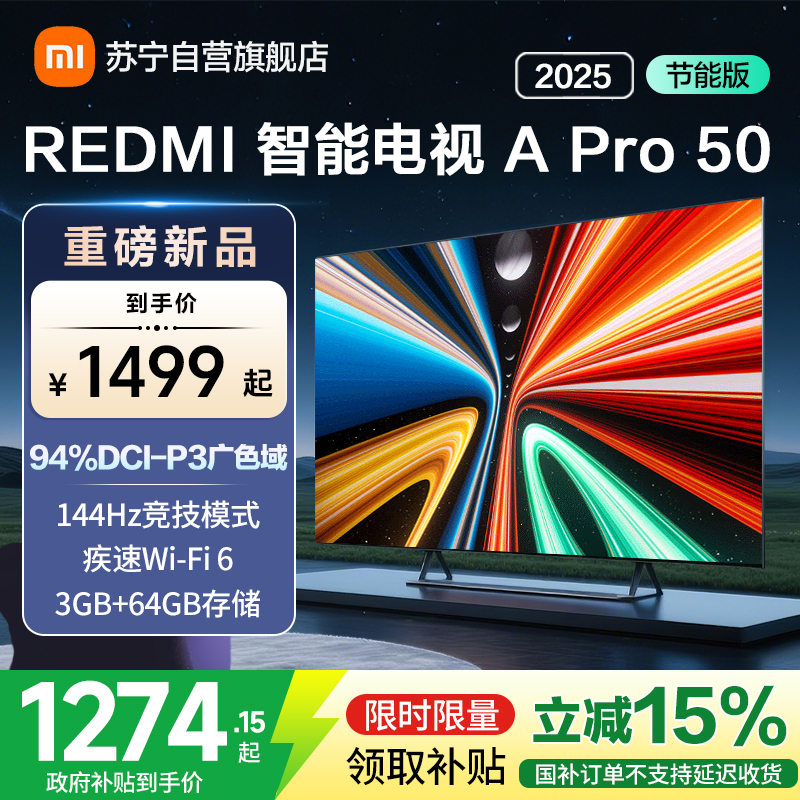 小米电视50英寸REDMI APro50 2025节能版3+64G大存储NFC智控遥控器144HZ竞技高刷语音