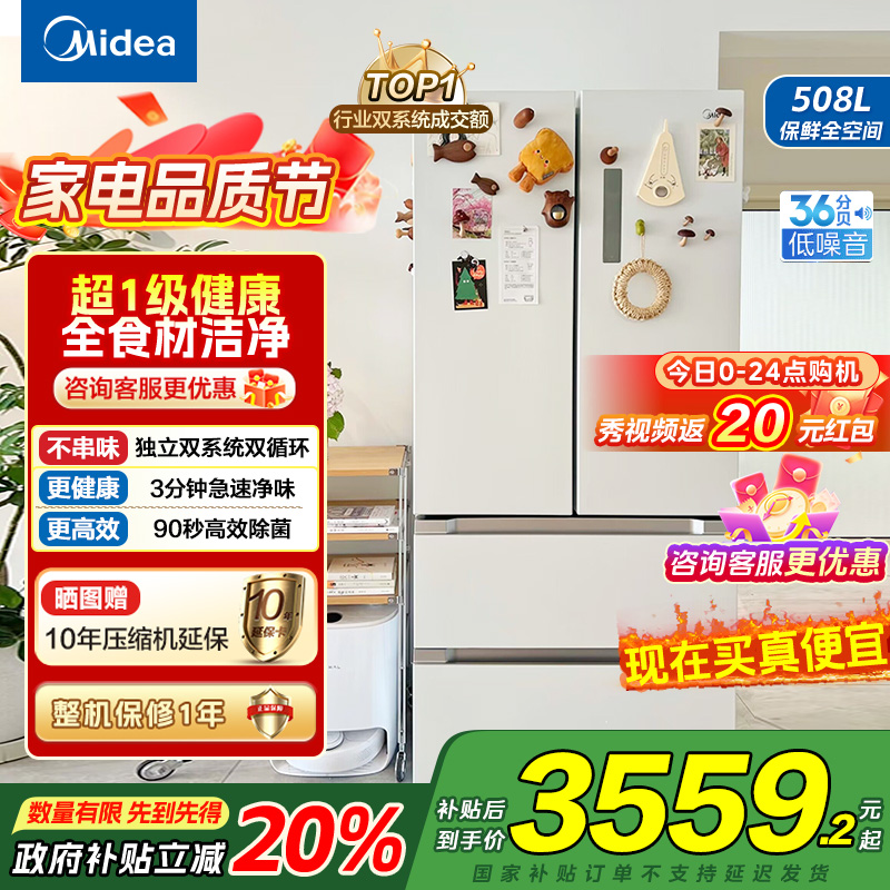 [自营]美的(Midea)508变频一级能效法式多门双系统双循环除菌净味冰箱大容量BCD-508WTPZM(E)白国补